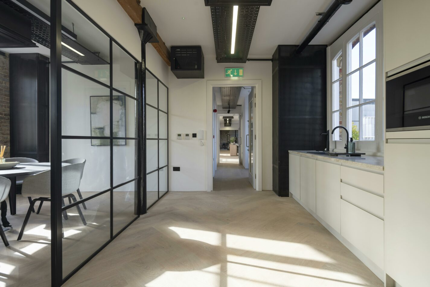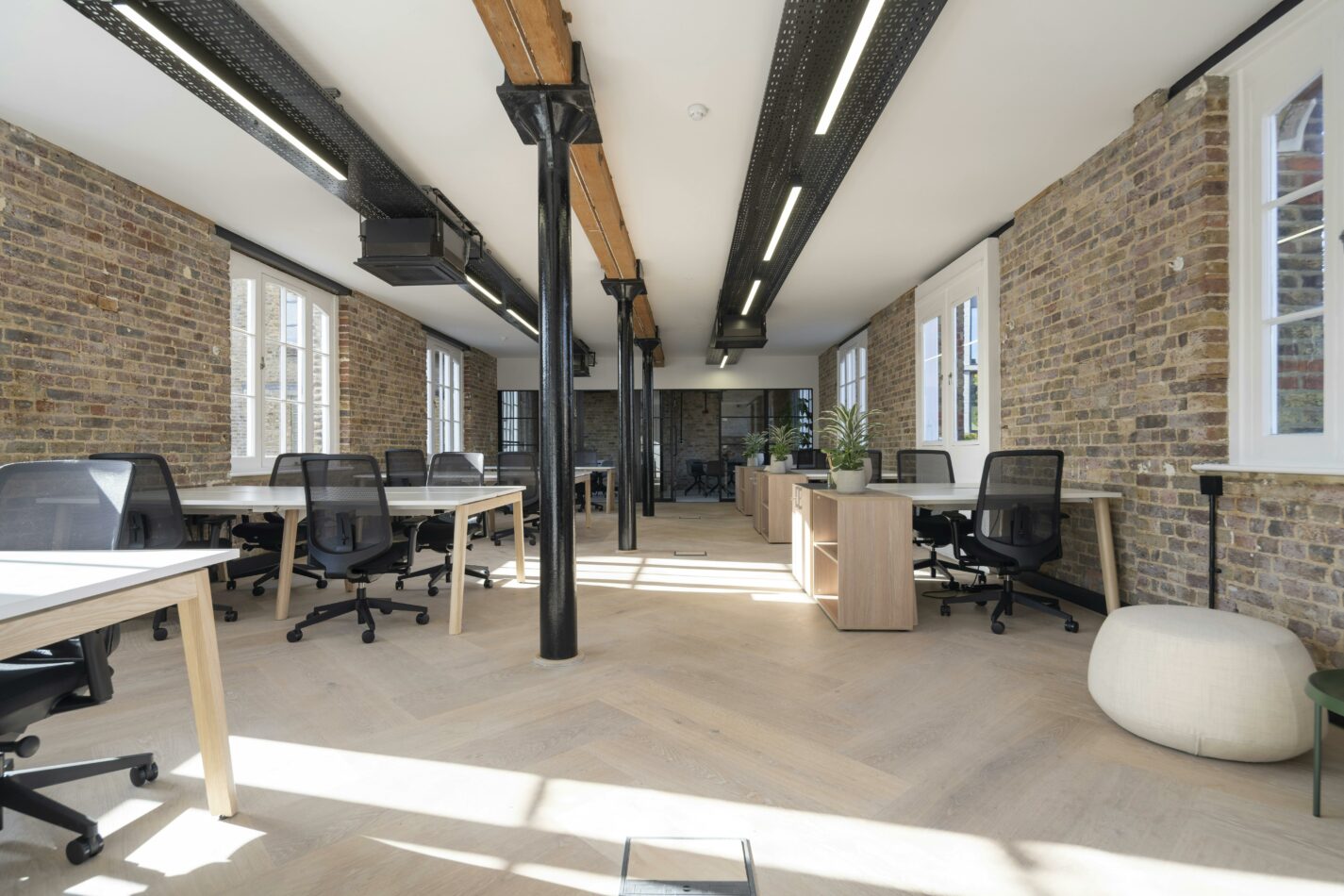 The 2nd Floor at 16 Bowling Green Lane has been newly refurbished while retaining its original character features, including wooden beams, exposed brickwork, and steel columns. Ideally located close to Farringdon Station, the space is offered fully fitted with 20 desks, 3 meeting rooms, a breakout area with soft seating, a demised kitchen, and WC facilities.