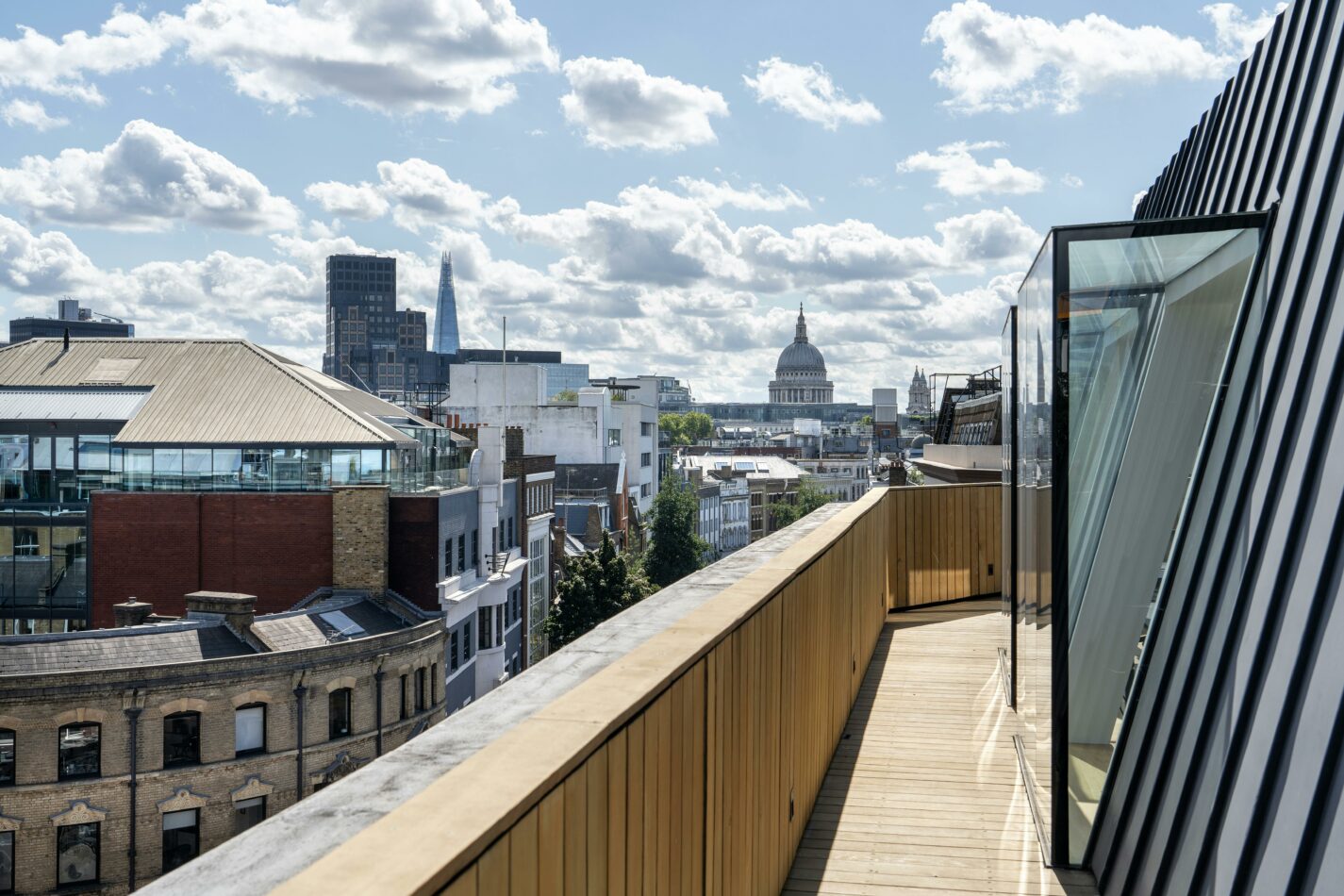 The 5th floor offers a high-spec fit-out with a meeting room, modern kitchen, and a private rooftop terrace boasting panoramic views of St Paul’s Cathedral and the City skyline.